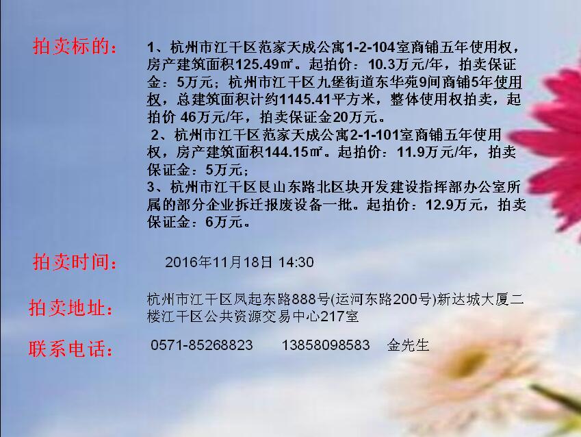 范家天成公寓商鋪使用權轉讓、報廢設備拍賣