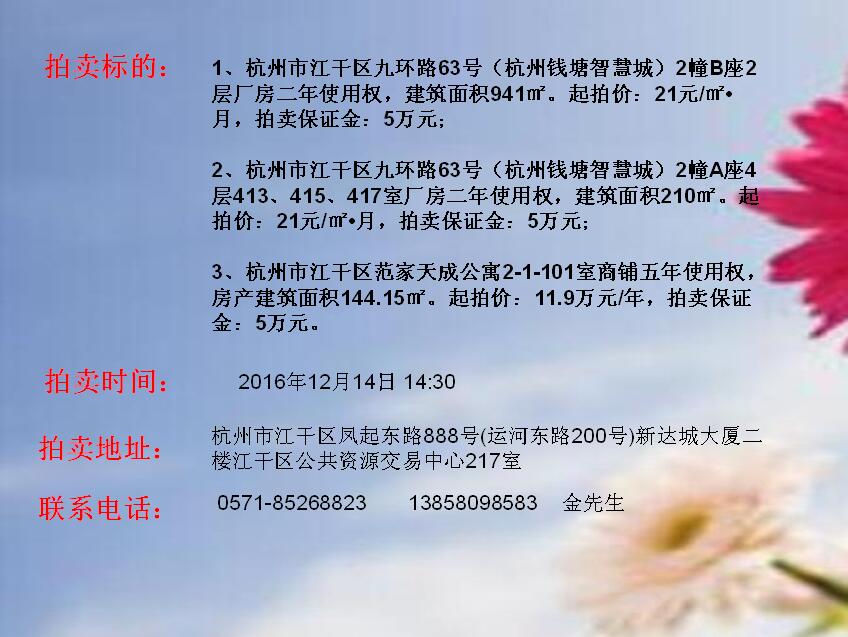 杭州錢塘智慧城標準廠房及范家天成公寓商鋪使用權轉讓拍賣