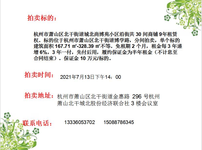 1、競(jìng)買人須在2021年7月12日下午16:00前向本公司交納拍賣保證金,交款后憑銀行繳款單、本人身份證原件及復(fù)印件或營(yíng)業(yè)執(zhí)照副本復(fù)印件于2021年7月9日、7月10日、7月12日9:30-16:30到杭州市蕭山區(qū)北干街道金惠路296號(hào)杭州蕭山北干城北股份經(jīng)濟(jì)聯(lián)合社3樓會(huì)議室辦理報(bào)名手續(xù)。