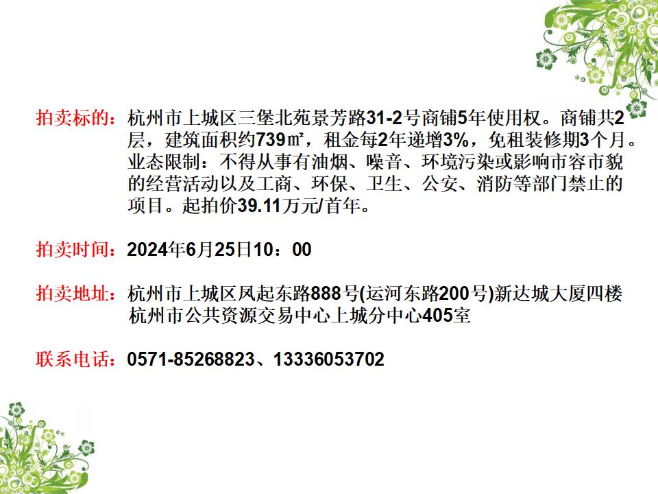 杭州市上城區三堡北苑景芳路31-2號商鋪5年使用權